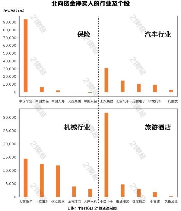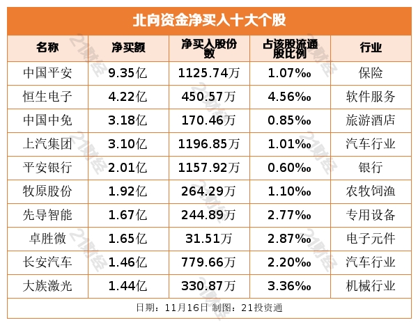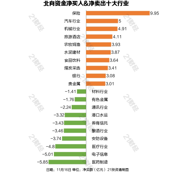据21投资通智能监测,11月16日,北向资金净买入25.89亿元,终结此前连续四天净卖出的态势。其中沪股通净买入37.66亿元,深股通净卖出11.76亿元,这与“沪强创弱”的行情一致。
