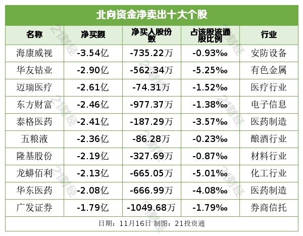 北向资金净卖出海康威视(002415.SZ)、华友钴业(603799.SH)、迈瑞医疗(300760.SZ)、东方财富(300059.SZ)、泰格医药(300347.SZ)居前,其中,海康威视被净卖出3.54亿元,华友钴业被净卖出2.90亿元,迈瑞医疗被净卖出2.61亿元,东方财富被净卖出2.46亿元,泰格医药被净卖出2.41亿元。