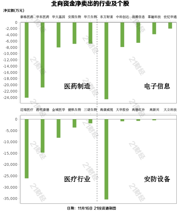 北向资金减持了22个行业,其中医药制造最多,净卖出金额达5.85亿元,其次是电子信息行业,净卖出5.01亿元。