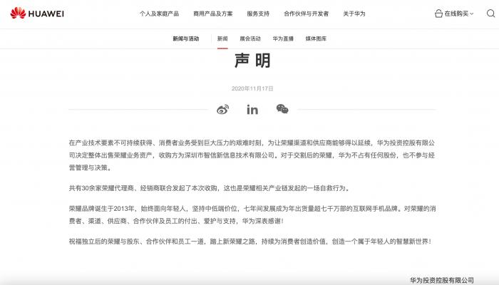 华为表示,在产业技术要素不可持续获得、消费者业务受到巨大压力的艰难时刻,为让荣耀渠道和供应商能够得以延续,华为投资控股有限公司决定整体出售荣耀业务资产,收购方为深圳市智信新信息技术有限公司。