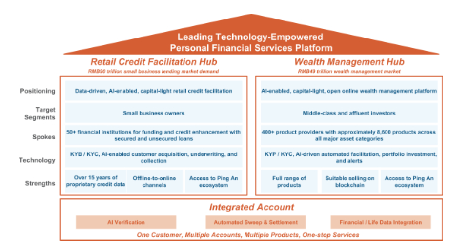 陆金所实施了一种独特的轻资本型、中心辐射式的商业模式,专注于大型,服务不足但极具吸引力的细分市场。我们的平台有两个“枢纽”,连接了数百个金融机构的“分支”,针对个人客户的需求和风险偏好量身定制的贷款和理财产品,有效地为客户提供合适的产品。截止至2020年6月30日,在零售信贷方面,平安普惠为1340万累计借款人提供服务,将与平台上超过50家银行、信托和保险公司合作,为小企业主提供大额融资。在财富管理方面,与429家金融产品服务公司进行深度合作,为1280万活跃投资者提供超过8600种产品。