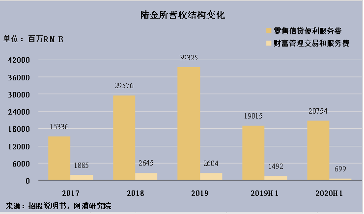 2017财年零售信贷便利服务费收入153.36亿人民币,占比89.05%,财富管理交易和服务费收入18.85亿人民币,占比10.95%;2018财年零售信贷便利服务费收入295.76亿人民币,占比91.79%,财富管理交易和服务费收入26.45亿人民币,占比8.21%;2019财年零售信贷便利服务费收入393.25亿人民币,占比93.79%,财富管理交易和服务费收入26.04亿人民币,占比6.21%; 2019年上半年零售信贷便利服务费收入190.15亿人民币,占比92.72%,财富管理交易和服务费收入14.92亿人民币,占比7.28%; 2020年上半年零售信贷便利服务费收入207.54亿人民币,占比96.74%,财富管理交易和服务费收入6.99亿人民币,占比3.26%。陆金所零售信贷便利服务费营收占比逐年上升,财富管理交易和服务费营收占比有所下降。