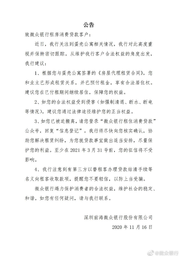 而蛋壳公寓口中的“与银行协商不还款”,实际上来源于一家合作银行主动发出的公告。11月16日,作为蛋壳“租金贷”合作方的微众银行公告称,对已被迫搬离的租户,可登录“微众银行租住消费贷款”公众号,回复“信息登记”,该行将尽快核实确认,协助解决租赁纠纷。同时微众银行表示至少在2021年3月31号前,租客的征信将不受影响。