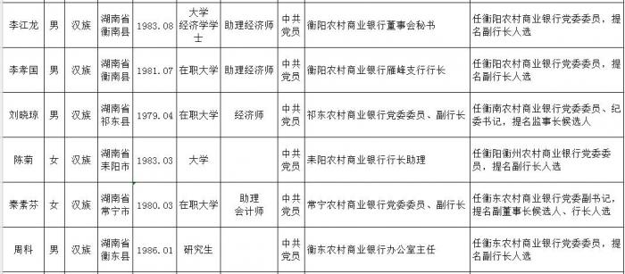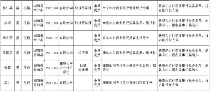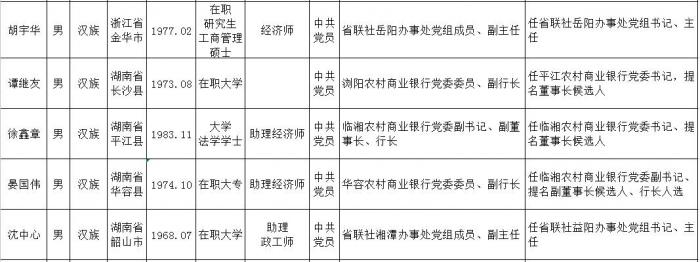 临湘农商银行党委副书记、行长徐鑫章任升任该行党委书记,提名董事长候选人;华容农商银行党委委员、副行长晏国伟任临湘农商银行党委副书记,提名副董事长候选人、行长人选。