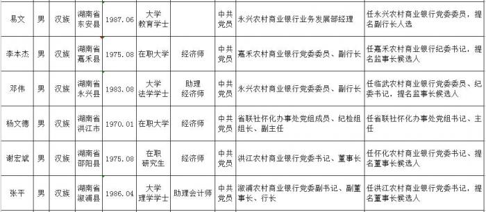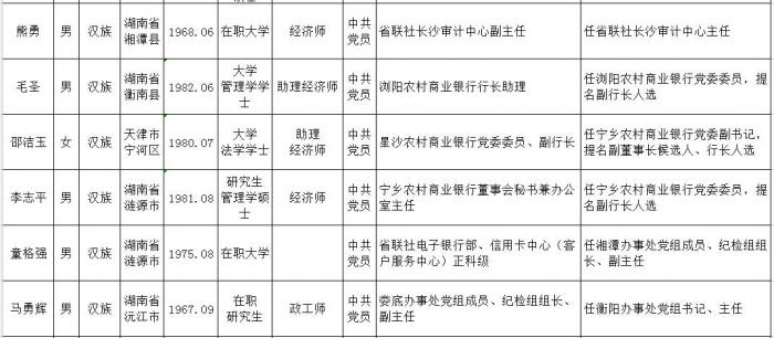 洪江农商银行党委书记、董事长谢宏斌,任怀化农商银行党委书记,提名董事长候选人。