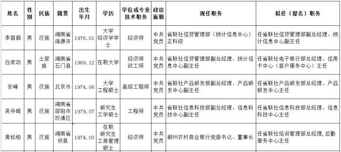 11月16日,湖南省农村信用社联合社发布干部任前公示,一次性对42名拟任职人选(提名人选或候选人)进行任前公示,包括9名湖南省农商银行董事长或行长人选。该任前公告显示,