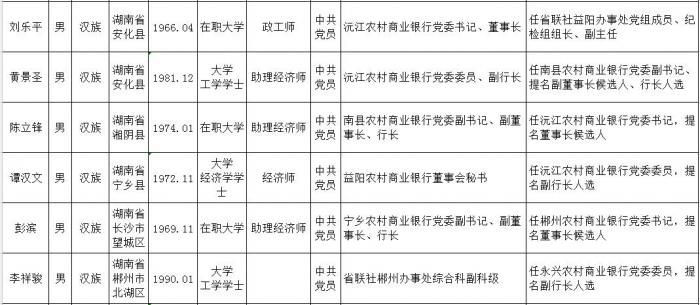 沅江农商银行党委委员、副行长黄景圣任南县农商银行党委副书记,提名副董事长候选人、行长人选。