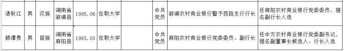 麻阳农商银行党委委员、副行滕潭贵,任中方农商银行党委副书记,提名副董事长候选人、行长人选。