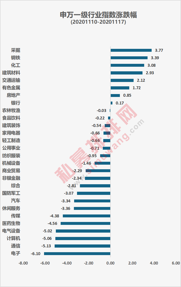 从11月10日以来,在申万28个一级指数中,仅有8个指数录得上涨,其余20个指数全部下跌,具体来看,申万电子跌幅6.10%垫底,通信、计算机、电子设备跌幅也全部超过5%,医药生物下跌4.56%紧随其后。