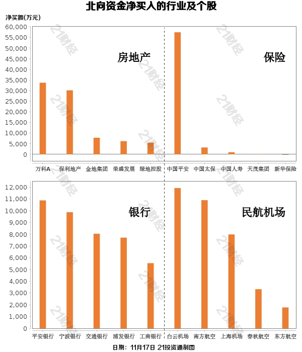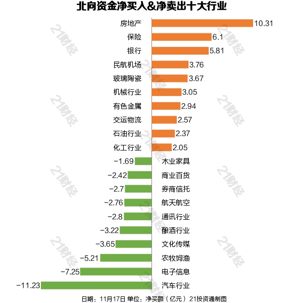 据21投资通智能监测,11月17日,北向资金先抑后扬,开盘后持续净流出,一度净流出近27亿元,临近午盘开始回流,全天合计净买入0.53亿元。