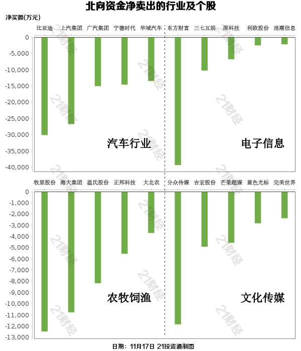 北向资金减持了33个行业,其中汽车行业最多,净卖出金额达11.23亿元;其次是电子信息行业,净卖出7.25亿元。