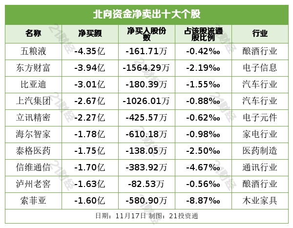 其中,五粮液被净卖出4.35亿元,东方财富被净卖出3.94亿元,比亚迪被净卖出3.01亿元,上汽集团被净卖出2.67亿元,立讯精密被净卖出2.27亿元。