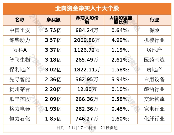 个股方面,北向资金净买入中国平安(601318.SH)、潍柴动力(000338.SZ)、万科A(000002.SZ)、智飞生物(300122.SZ)、保利地产(600048.SH)居前,金额分别为5.75亿元、3.57亿元、3.37亿元、3.18亿元、3.02亿元。