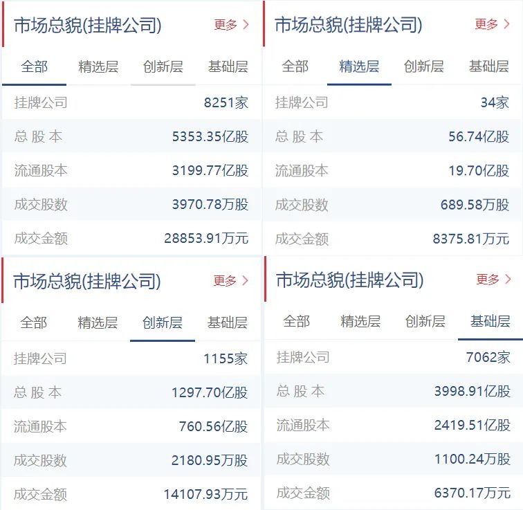 新三板挂牌公司总计8251家(精选层34家,创新层1155家,基础层7062家),总股本5353.35亿股,流通股本3199.77亿股。