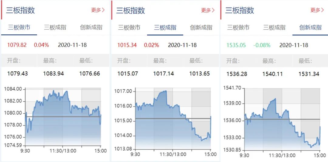 截至11月18日收盘,三板做市报1079.82点,上涨0.04%;三板成指报1015.34点,上涨0.02%;三板创新成指报1535.05点,下跌0.08%。