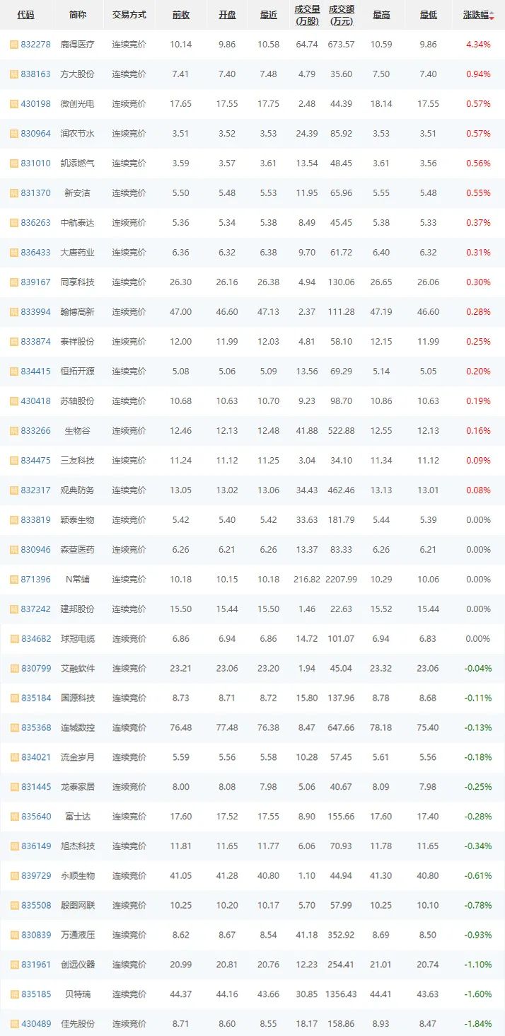 11月18日,精选层涨跌互现,34家企业16家涨,5家平盘,13家跌;其中,鹿得医疗(832278)连续三日涨幅居首,上涨4.34%;其次,方大股份(838163)上涨0.94%;佳先股份(430489)下跌1.84%,跌幅居首;贝特瑞(835185)下跌1.60%居次;颖泰生物(833819)、森萱医药(830946)等平盘。