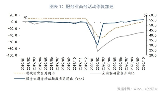 10月份全国服务业生产指数当月同比增长2个pct至7.4%。服务业生产指数年内首次超过工业增加值当月同比。服务业生产修复加快。国家统计局披露的信息显示,铁路运输、航空运输、住宿餐饮、文化体育娱乐等行业商务活动指数位于59.0%以上较高景气区间。这些受到疫情影响较为严重的行业持续保持高景气意味着经济进入更深层次的修复。