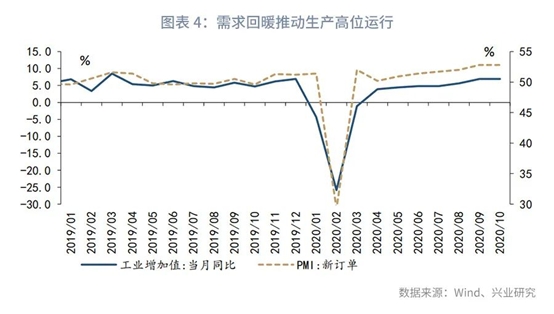传统动能方面,10月工业增加值当月同比录得6.9%,生产受益于新订单回升、产成品库存去化,当月同比为2015年同期最高值。