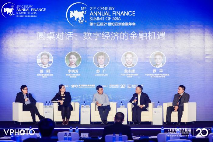 11月11日,在第十五届21世纪亚洲金融年会主论坛圆桌对话上,国家金融与发展实验室副主任曾刚担任嘉宾主持,建设银行普惠金融事业部副总经理李晓芳、云南信托总裁舒广、兴业银行零售网络金融部总经理詹志辉、中国科学院计算技术研究所副教授兼庖丁科技首席科学家罗平等资深从业者齐聚一堂。