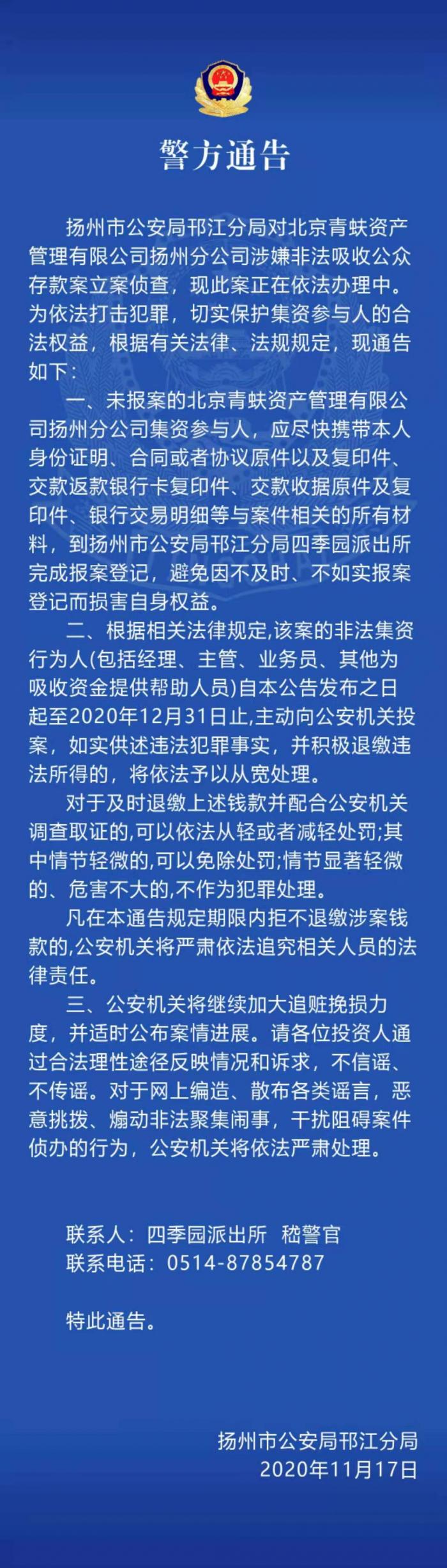 11月17日,江苏省扬州市公安局邗江分局官方公号“平安邗江”发布两份警方通告,引起关注。