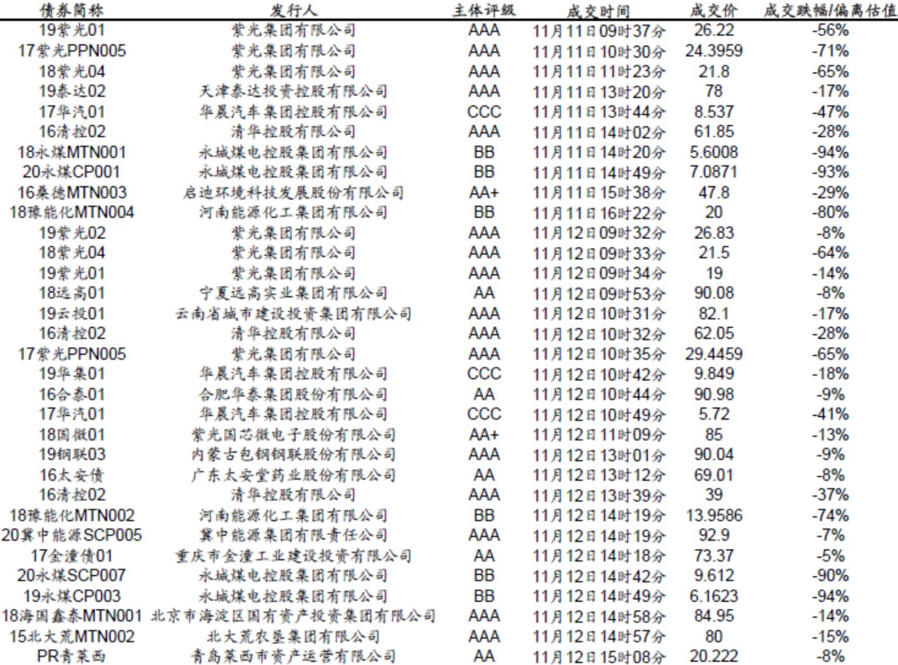 抛售大潮已至,债券价格狂跌不止。自11月11日开始,债券违约事件已使得多只地方国企债券暴跌,市场几乎遍地卖盘,难见买盘,投资者询价已经不谈收益率,直接净价打折抛售。其中,永煤和华晨的个券价格已经跌至个位数,紫光、清控、豫能化、启迪也大幅下降。