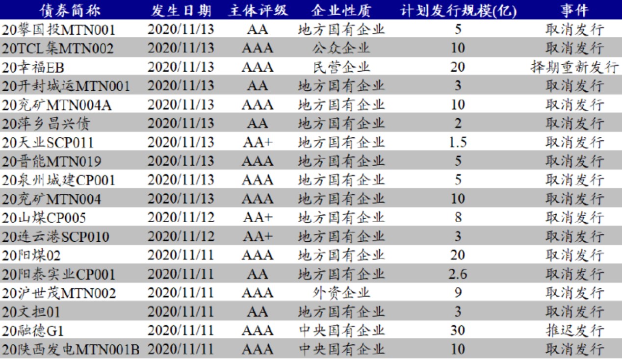 一级市场未能幸免,发行人再融资能力受质疑。二级市场在恐慌的同时,不可避免的将负面情绪传导至一级市场,山煤、阳煤、阳泰拟发行的债券均取消发行,兖矿、同煤、陕煤化、晋能债券均延迟过簿记时间,合计更有共计157.1亿的债券一级取消发行,其中绝大部分为地方国企,甚至波及其他省份城投企业与强资质的产业主体,该违约事件几乎打击了所有类型发行人的再融资能力。