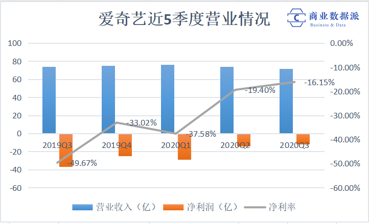 截至今年9月30日,爱奇艺累计亏损54.8亿元。而在2018和2019年,爱奇艺的净亏损高达91亿元和103亿元。若Q4不出意外,今年将是爱奇艺近三年来亏损情况最为缓和的一年。第三季度,爱奇艺的净亏损从去年同期的37亿元下降至12亿元,环比也下降了19%。营业收入同比下降3%至72亿,营业成本同比下降22%至64亿,后者连续两个季度控制在低于前者的范围内。