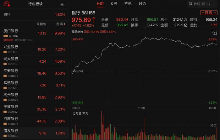 其中,次新股厦门银行(601187.SH)领涨,于10:30首板涨停;5家银行涨幅超3%,除厦门银行外,兴业银行(601166.SH)、光大银行(601818.SH)、平安银行(000001.SH)、常熟银行(601128.SH)涨幅分别达到7.20%、4.69%、3.53%、3.11%。