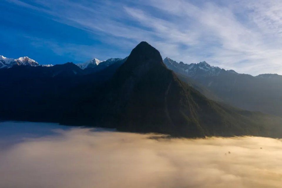 易贡沟被两侧高大的雪山夹住,山巅上积着耀眼的雪,雪线之下的山坡上,植被浓密如地毯。山脚,蓝色的易贡湖愉悦地伸展。它们和谷地上的茶园,组成了一幅极富层次感的风景画。