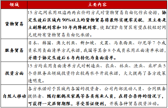 根据商务部消息,RCEP协定由序言、20个章节、4个市场准入承诺表附件组成。协议涉及货物贸易、服务贸易、投资以及人员往来等多方面,相较以往协议,RCEP对于贸易、投资的限制更加减少,给商业往来提供更多的便利。例如:货物贸易方面,协议生效后区域内90%以上的货物贸易将最终实现零关税,区域内企业将面对更广阔的市场、更充分的竞争,明显降低区域内贸易成本和产品价格,惠及各方企业和消费者。在人员流动方面,将承诺适用范围扩展至服务提供者以外的投资者、随行配偶及家属等协定下所有可能跨境流动的自然人类别,进一步提升了人员往来的便利性。