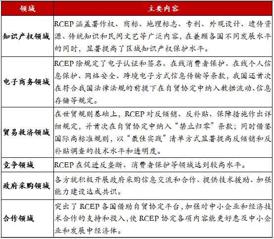 RCEP对标国际高水平自贸规则,更加广泛的纳入了知识产权、电子商务、竞争、政府采购等议题,又在中小企业、经济技术合作等领域作出加强合作等规定。