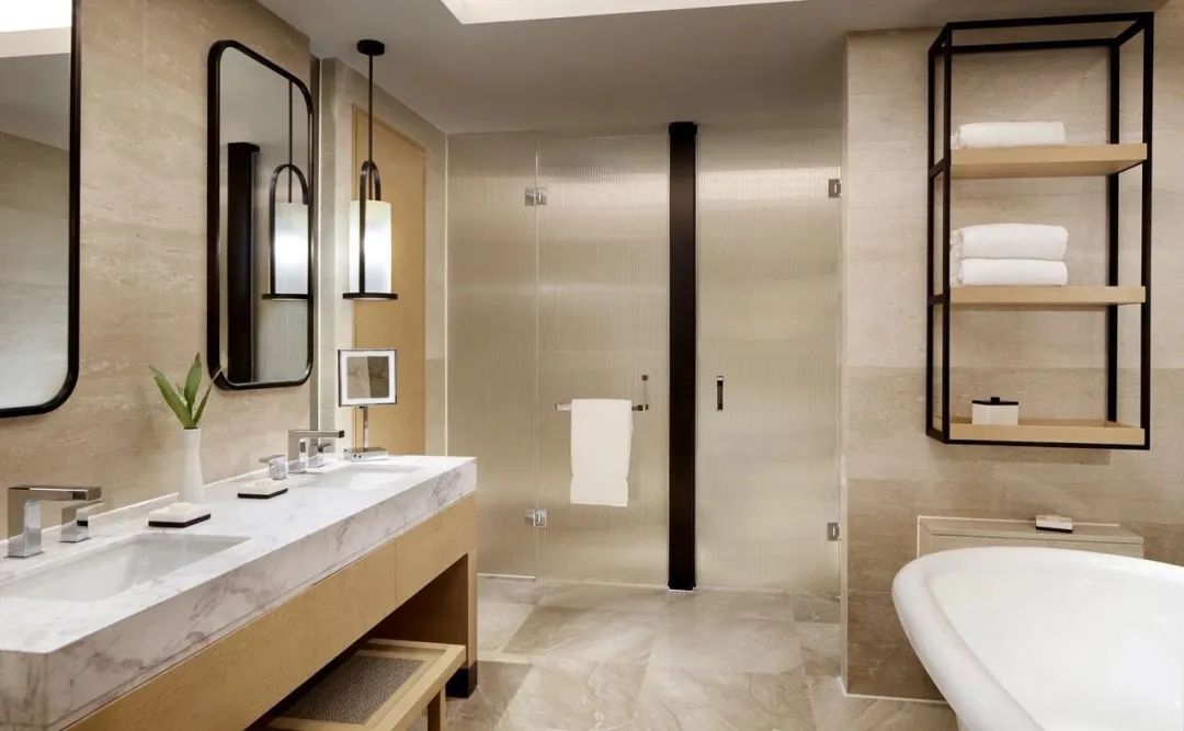 除此之外,酒店设有395间客房,为入住旅客提供多样的选择。客房风格现代化,设施齐全,配有电视、餐桌椅以及咖啡机。每间客房均设有特大私人露台及大理石铺砌的浴室。
