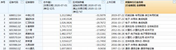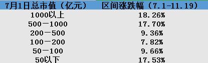 统计7月1日至11月19日涨跌幅可以看出,沪深A股平均涨幅为13.97%,而在7月1日市值便已超过1000亿元的个股同期涨幅为18.26%,500亿元至1000亿元区间个股涨幅为17.7%。