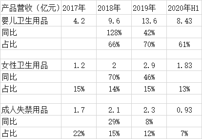 过去高增长背后是三大类业务规模上升所致,尤其是婴儿卫生用品及女性卫生用品在2018-2019年均维持高增长趋势。