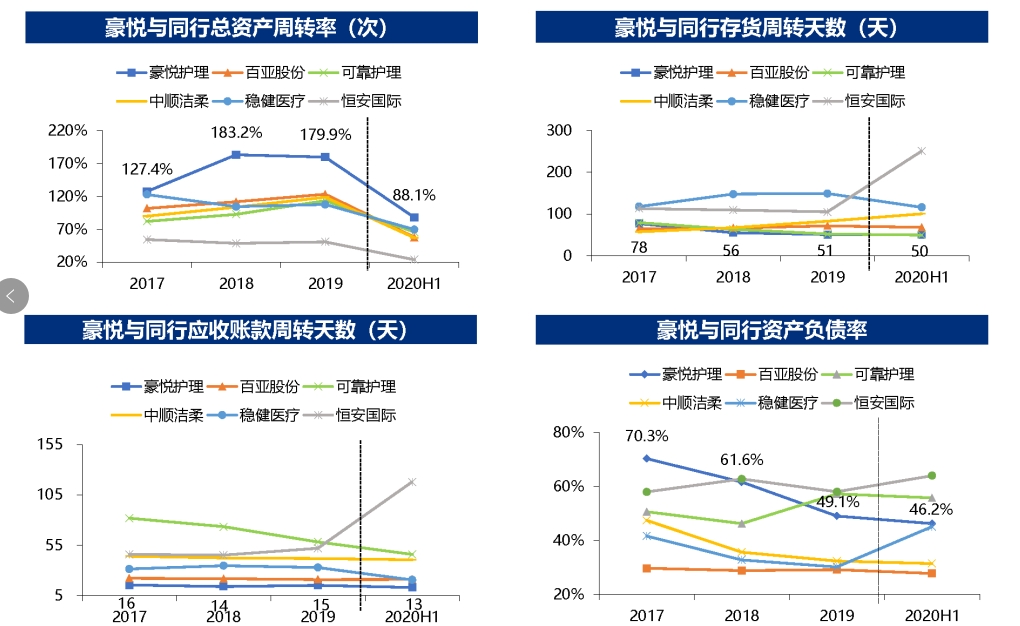 豪悦护理的净利率从2016年的8.8%上升至27.4%,毛利率提高因素带动外,公司的三项费用(销售、管理、财务)从2016年的25.7%逐年下降至2020年H1的9.1%,基本可以理解为公司品牌提升后,没必要的开支尽可能的压缩到极致。