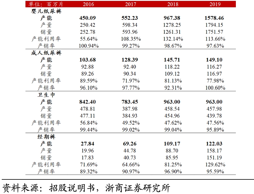 1、婴儿纸尿裤年产能为15.78亿片,较2017年5.52亿片的年产能增长约2倍且几乎满产满销;