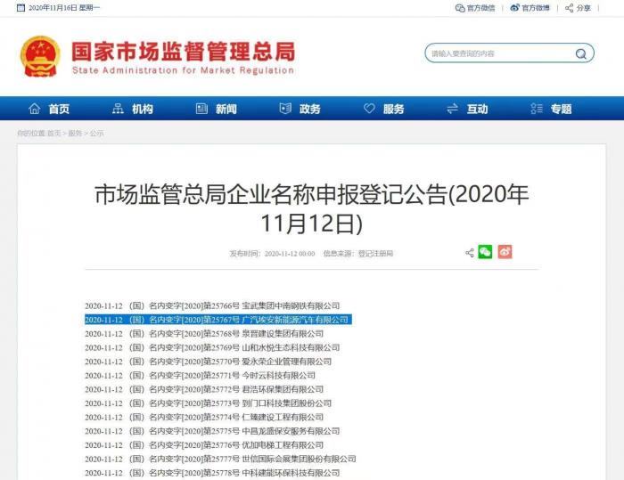 11月12日,国家市场监督管理总局企业名称申报登记公告显示,“广汽埃安新能源汽车有限公司”已申报。11月16日,“广汽新能源汽车有限公司”名称更改为“广汽埃安新能源汽车有限公司”,注册资本由7.83亿元变更为14.19亿元。