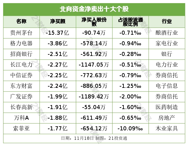 北向资金净卖出贵州茅台(600519.SH)、格力电器(000651.SZ)、招商银行(600036.SH)、长江电力(600900.SH)、中信证券(600030.SH)居前,其中,贵州茅台被净卖出15.37亿元,格力电器被净卖出3.86亿元,招商银行被净卖出2.51亿元,长江电力被净卖出2.27亿元,中信证券被净卖出2.25亿元。