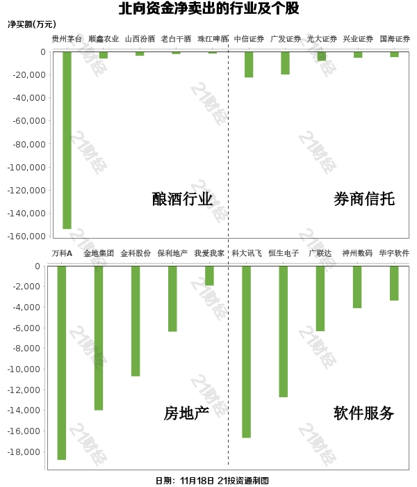 北向资金减持了28个行业,其中酿酒行业最多,净卖出金额达13.33亿元,其次是券商信托行业,净卖出6.42亿元。