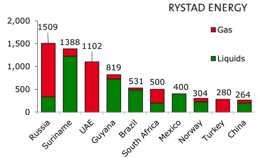 数据显示,今年前10个月,俄罗斯、苏里南共和国、阿联酋新发现的常规油气规模位居全球前三甲,探明可采储量分别为15.09亿桶、13.88亿桶、11.02亿桶油当量,紧随其后的是圭亚那、巴西、南非。