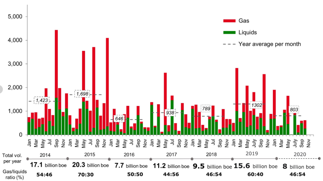 2014年-2020年间,全球常规油气发现储量在2015年录得最高值,为203亿桶油当量;2016年全球常规油气发现储量创下近几十年来的最低点,仅为77亿桶。如此来看,2020年前10个月全球油气新发现储量已超过2016年的水平。