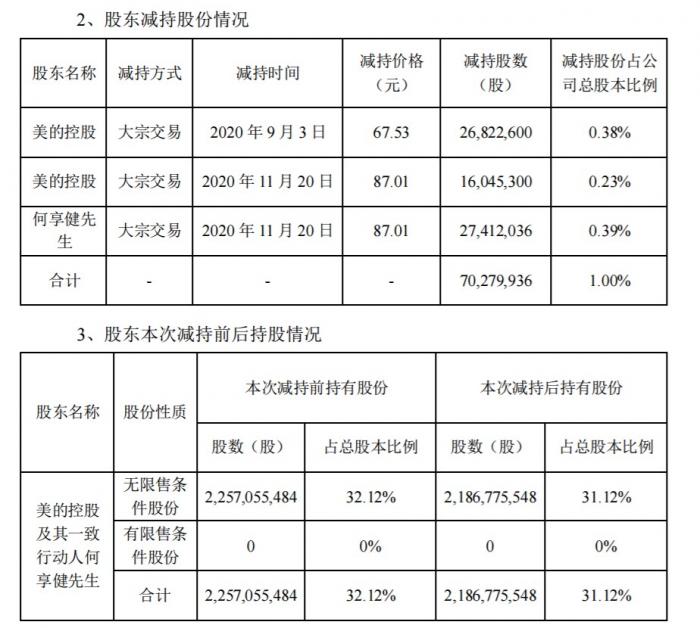 11月20日晚,美的集团(000333.SZ)公告,美的控股及一致行动人何享健于9月3日和11月20日通过大宗交易累计减持公司1%股权。