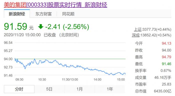 截至11月20日收盘,美的集团股价报收91.59元,较前一交易日下跌2.56%。