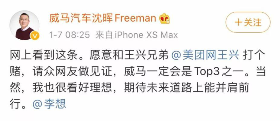 这让在刚过去的2019年,取得销量第二名好成绩的威马着实有些尴尬。沈晖随即在微博上表态「如果威马汽车能挺进造车新势力前三名,希望美团创始人王兴能充当外卖小哥亲自送一份外卖上门,地点由我指定;如果威马进入前三失败就送一辆车给王兴,可在所有品牌中随便挑选,不一定非得是威马汽车。」