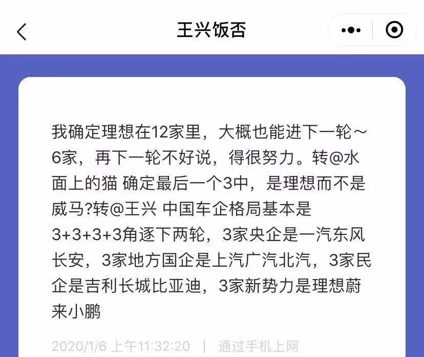 可见即便是拿到了百亿融资,上市在即,威马仍然无法高枕无忧,这不禁让人想起了王兴和沈晖的那次交锋。今年年初,王兴曾在饭否上表示中国车企格局基本是3+3+3+3角逐下两轮,最终胜出的造车新势力只有三家,分别是理想、蔚来、小鹏。