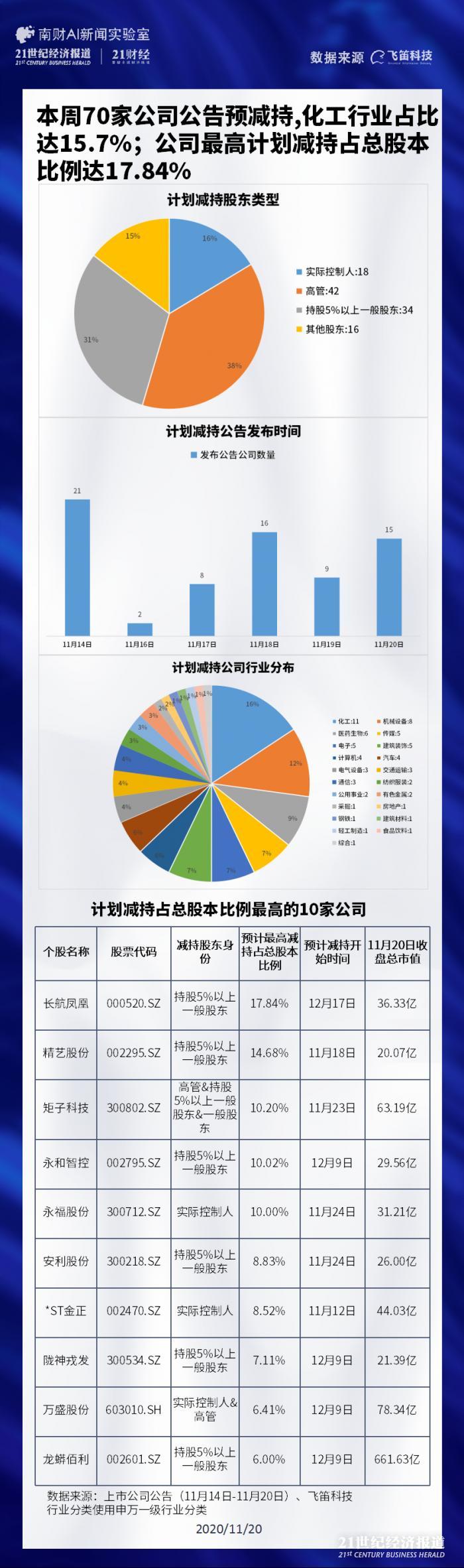 飞笛科技统计了11月14日-11月20日收盘时间区间内发布的上市公司公告中,计划减持比例最高的10家公司。分别为长航凤凰(000520.SZ)、精艺股份(002295.SZ)、矩子科技(300802.SZ)、永和智控(002795.SZ)、永福股份(300712.SZ)、安利股份(300218.SZ)、*ST金正(002470.SZ)、陇神戎发(300534.SZ)、万盛股份(603010.SH)、龙蟒佰利(002601.SZ) 。