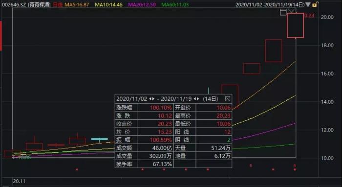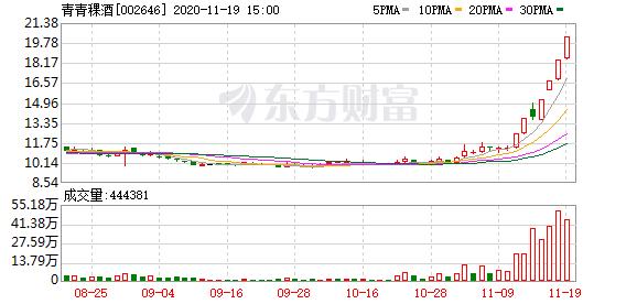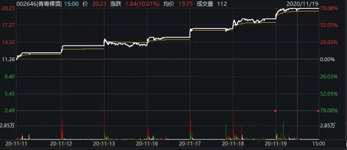 值得注意的是,这已是青青稞酒连续第四天涨停。而从11月11日起的7个交易日中,该股斩获6个涨停板,分别于11月11日、11月12日、11月16日、11月17日以及11月18日、11月19日涨停。期间股价上涨超78%,市值增加近40亿元,距离百亿市值公司仅差一个涨停。