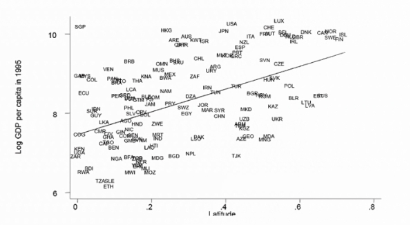 接下来,我们开始讲中国经济史和金融史的一个逻辑。在全球的视角下,文化是一种非正式制度。文化是由什么决定的呢?地理在其中发挥了很重要的作用。比如有很多研究认为纬度跟经济发展紧密相关:纬度越高,天气相对寒冷一点,经济表现就越好。下图横轴是纬度,纵轴是经济发展水平(人均GDP),它们是正相关关系,其中每一个观测值都是一个国家。