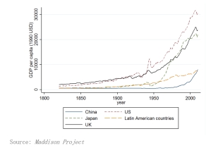 图上列举的是中国、美国、日本、拉美国家和英国。可以看到,在这个漫长的历史长河中,应该说是在公元1500年之前,大家都没有太大的变化,事实上中国还略高一点点。也就是说在历史上大家生活水平都差不多,所以这个是我们的古代史。到了1800年以后,英国开始起来并一骑绝尘;美国起来的稍微晚一点,但迅速赶超;日本以前是非常差的,但是二战后也迅速地在赶超;拉美国家停滞了非常长的时间,后来开始赶超。中国是启动最慢的,但是在改革开放之后是直接拉升的。