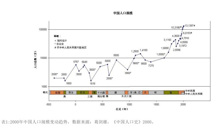 中国的农业社会是符合马尔萨斯社会的一个状况。我们的农耕技术一直在进步,但是农民日复一日的过着同样的生活,人口一直在增加。我们来看中国传统社会人口增加的状况,春秋战国的时候只有2000万人,到西汉早期的时候因为战争死掉一部分人,基本上长期都是在几千万的水平。到了唐朝的时候,最高达到8000多万人,后来经过五代十国的战乱,又下降到3900万人。宋朝时,人口第一次突破了1亿。但是经过元朝反反复复的打仗,人口下降到了7000多万。明朝人口持续增加,到明末清初的时候,人口又突破一个亿。到了清朝的时候,由于引进了美洲的作物,比如马铃薯、玉米、红薯等,人口迅速的增加。中国有一个人口爆炸时期,就是清朝的康雍乾盛世。清末的时候我们说4万万同胞,但是在民国之后的一系列战争,尤其是二战,人口大幅下滑了。但是在新中国成立以后,人口迅速的增长,到了现在一个状况。所以我们看到人口增长背后都是技术的进步,但是人均生活水平在传统社会没有太大增加,也就是中国古代社会是一个典型的马尔萨斯社会:制度是有一些变化,经济的情况也有一些变化,但是生活水平变化并不大。